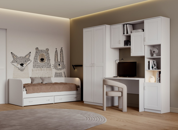 Коллекция мебели для детской «Радуга» — это стильный и современный подход к обустройству детской комнаты. Она сочетает в себе актуальные тенденции дизайна и высокое качество материалов. Изготавливаемая из ЛДСП, с фасадами в рамке, данная коллекция предлагает комплексное решение для создания уютного и функционального пространства для вашего ребенка.