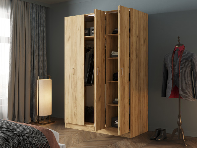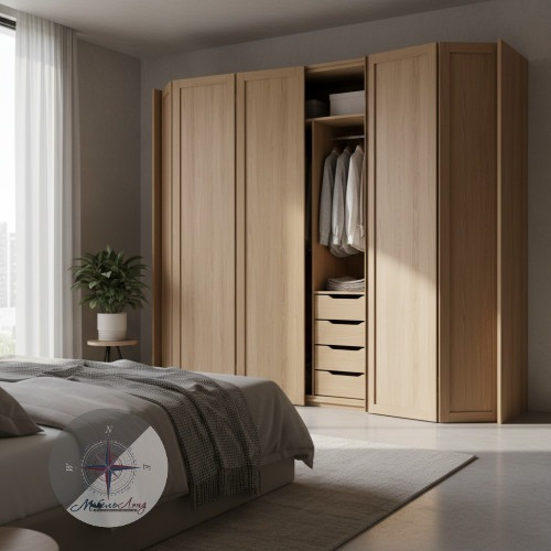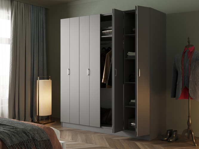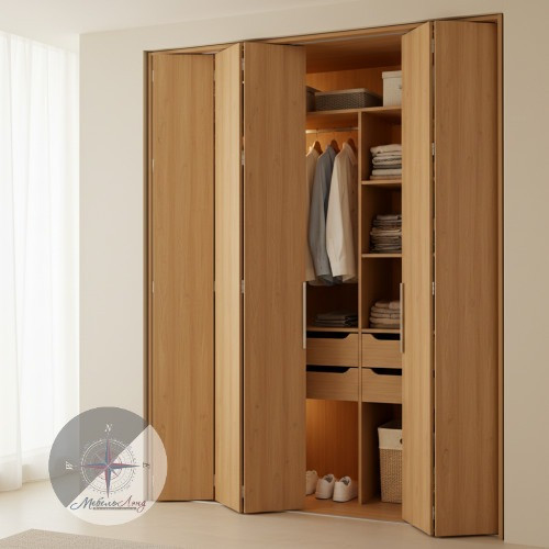Такой шкаф выглядит оригинально и элегантно, добавляя изюминку в любой интерьер, а также является хорошим альтернативным вариантом распашному шкафу или шкафу-купе. Особенность складывающегося механизма двери заключается в существенной экономии свободного пространства, что очень важно в квартирах или офисах с небольшой площадью.