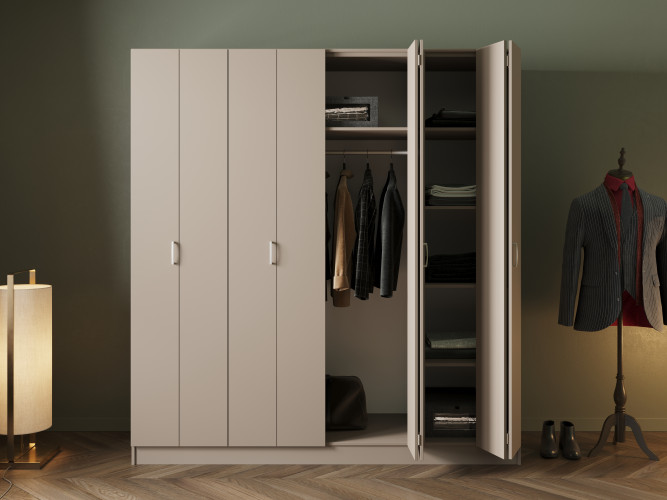 Главной особенностью шкафов являются их оригинальные двери - «гармошка». Они способны складываться и сдвигаться друг на друга, по типу гармошки. Данный механизм скрадывает 5 см внутреннего пространства (шкаф-купе – 10 см). В открытом состоянии сохраняется доступ ко всему внутреннему наполнению шкафа в отличии от шкафа-купе. Система раздвижения с такой дверью очень функциональна, компактна и удобна в использовании.