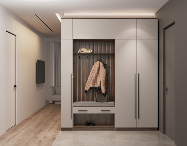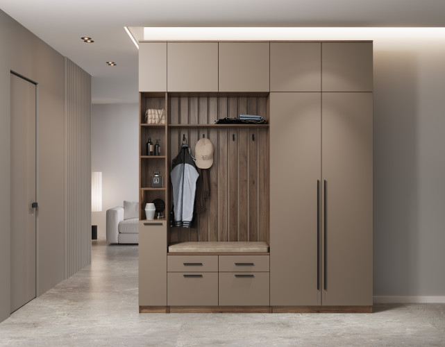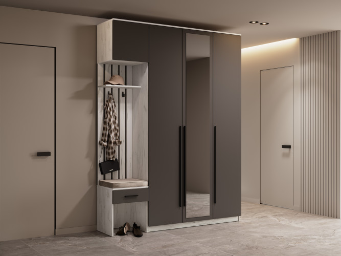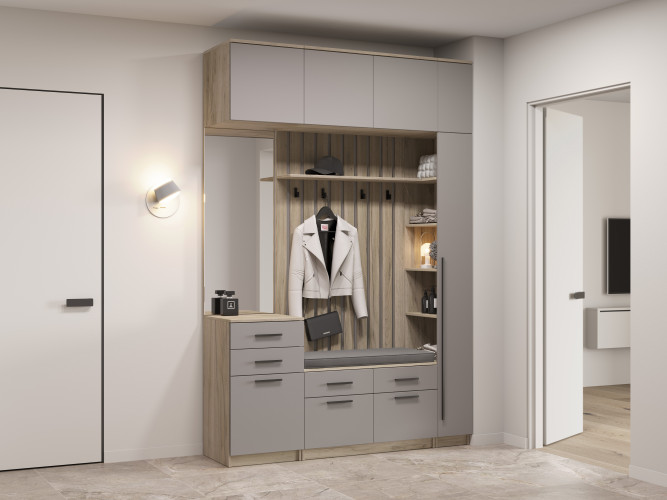 Лаконичный дизайн с однотонными фасадами и корпусами "под дерево" украсит интерьер вашего дома. Элегантная матовая черная фурнитура придает композиции динамику и хорошо сочетается с вертикальными рейками на открытой вешалке. Удачным дополнением станут стеллажи с открытыми полками, где можно расположить милые безделушки или полезные аксессуары.